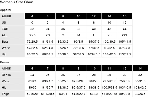 - Model is 5’11 and is wearing a size AU 8. Measurements may vary slightly by size.