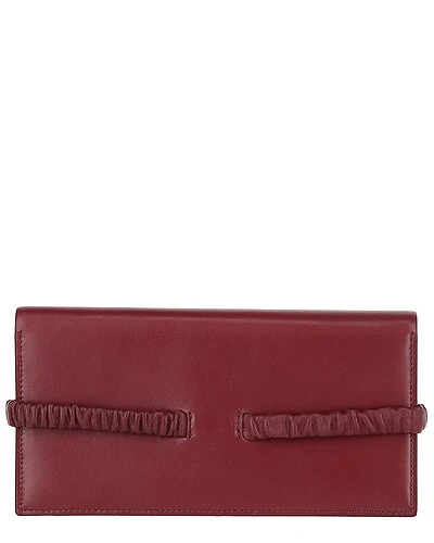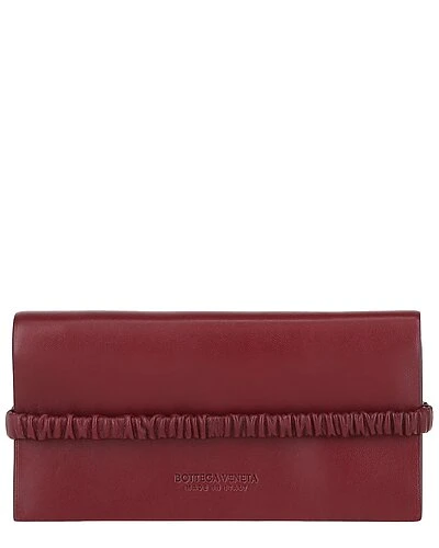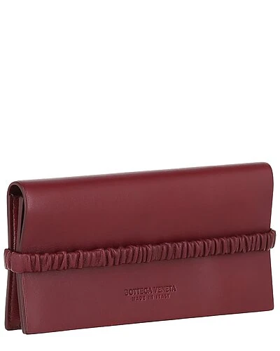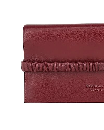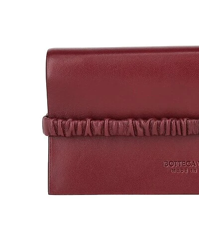 - Leather Wallet in bordeaux leather with smooth texture and ruched strap wrapped around wallet