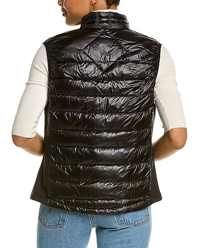 - Hybridge Lite Vest in black with quilted design, solid paneling, patch logo and two front zippered pockets