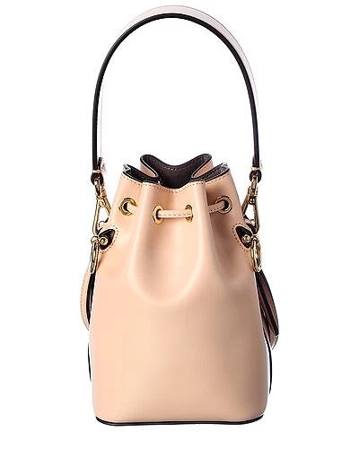 - Mon Tresor Mini Leather Bucket Bag in pale pink leather with gold-tone hardware and logo charm detailing