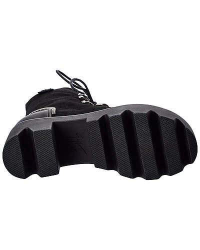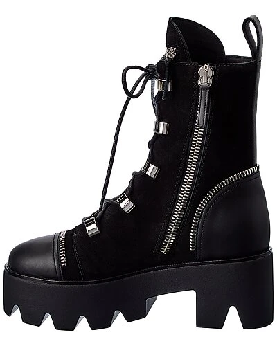 - Daikiri 20 Suede & Leather Platform Boot in black suede and leather and silver-tone hardware with zipper trim and inner side zipper