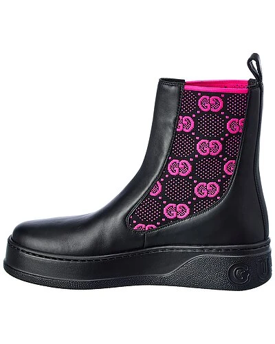 - GG Knit & Leather Bootie in hot pink GG knit textile and black leather with pull-on tab