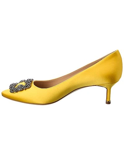 - Hangisi 50 Satin Pump in yellow satin and silver-tone hardware with crystal-embellished buckle