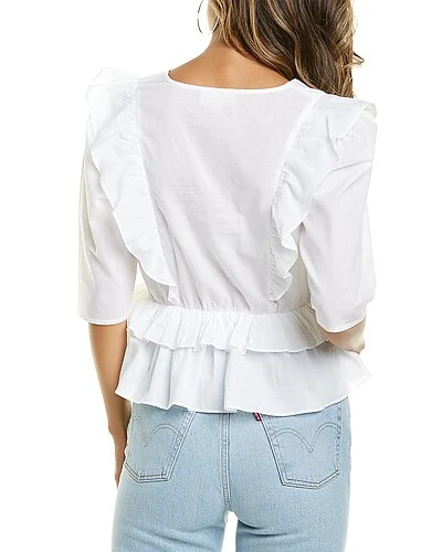 - Design details: V-neck, ruffled trim, elbow-length sleeves, and elasticized peplum hem