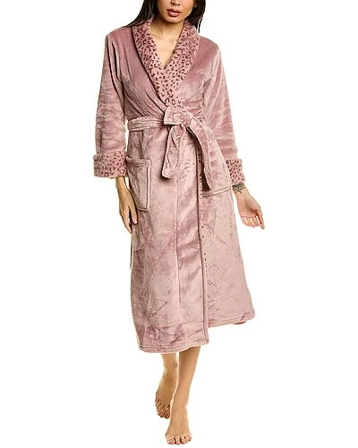- Plush Lynx Robe in nude blush with faux fur trim, shawl lapel, two front pockets, and tie-sash at waist