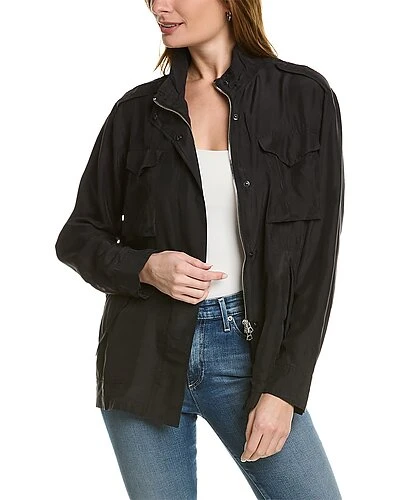 - Roth Silk Field Jacket in black with strap accent at shoulders, four front flap pockets and adjustable snap cuffs