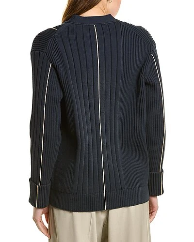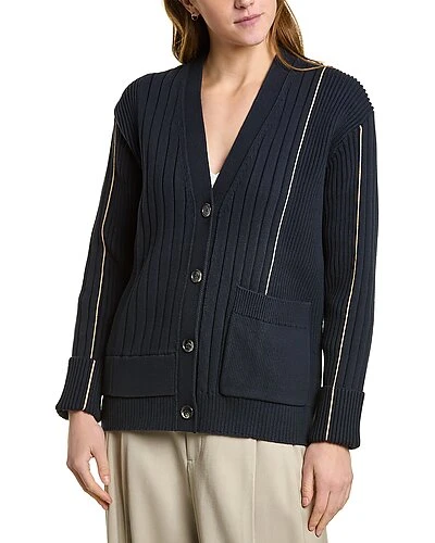- Ribbed Cardigan in navy & beige with ribbed knit design, V-neck, front right pocket, layered hem, roll-up cuffs, and contrast trim