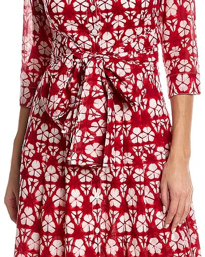 - Audrey 3 Shirtdress in white red Shibori exploration with 3/4-length sleeves, pleated skirt, side seam pockets, removable belt, and tie sash