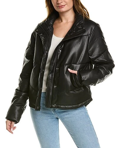 - Puffer Coat in black with faux leather design, funnel neck, and two front pockets