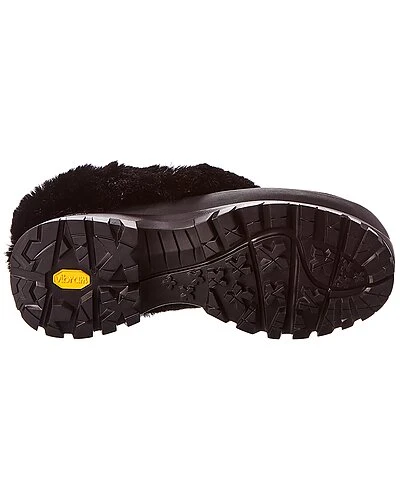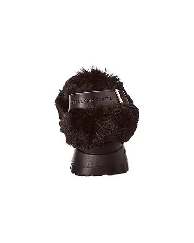 - FFF Trace Clog in black vegan-friendly faux leather and faux fur and gold-tone hardware with chunky sole