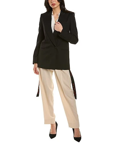 - Luisa Wool Jacket in black with peak lapel, left chest pocket, dual front pockets, button cuffs, vented back hem, and self-tie sash at waist