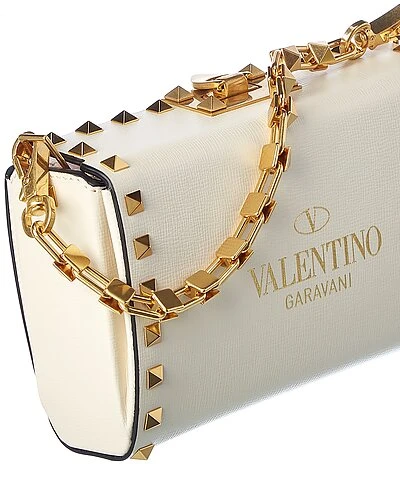 - Rockstud Alcove Leather Shoulder Bag in white leather and gold-tone hardware with chain detail and rockstud trim
