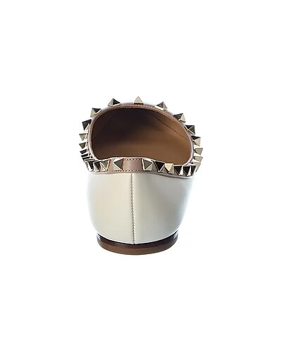 - Rockstud Leather Flat in white leather with platinum-finish rockstuds and powder leather trim