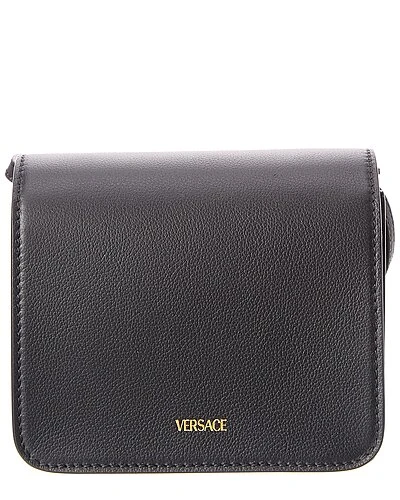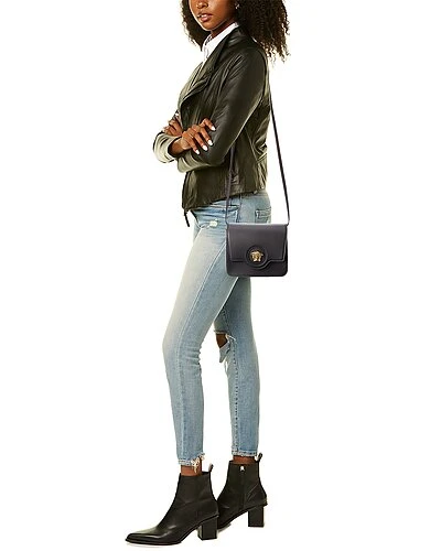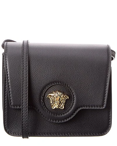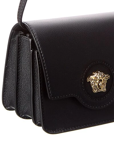 - La Medusa Leather Shoulder Bag in black leather with gold-tone hardware and Medusa head logo accent